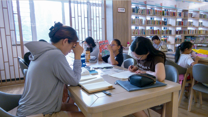 走进图书馆,映入眼帘的是一片清凉静谧、书香弥漫的景象。馆内座无虚席,中小学生们或是伏案书写,或是沉浸在课外读物的世界里;大学生们则带着电脑和专业书籍,为考研、实习做着准备。在少儿阅读区,不少家长陪伴孩子共读,一起沉浸在书香中,市民韩女士就经常带着孩子来图书馆一起阅读、一起学习。